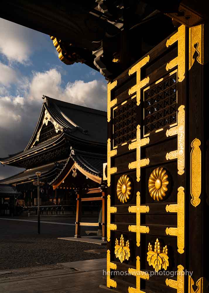 The Amida-do-Hall at golden hour, with Kyoto Tower in the distance.