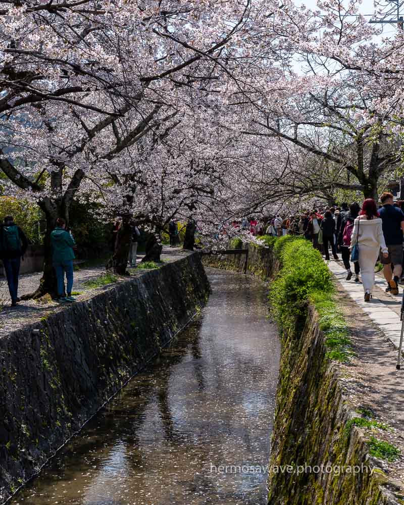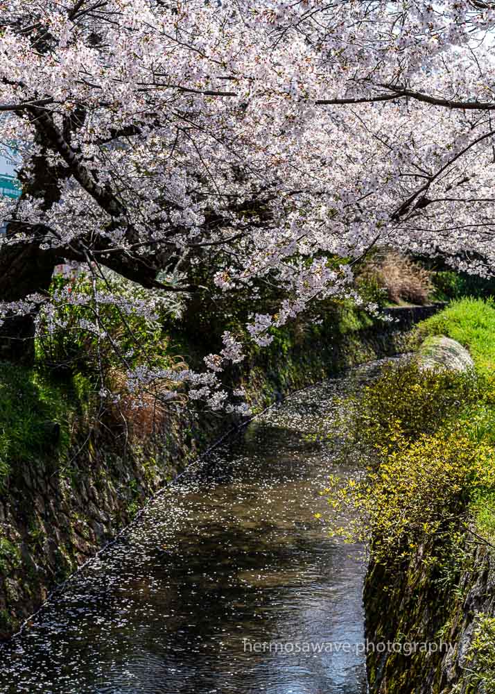 Petals from the cherry trees along the Philosopher's Path collect downstream, forming a pink canvas for a tree's shadow.